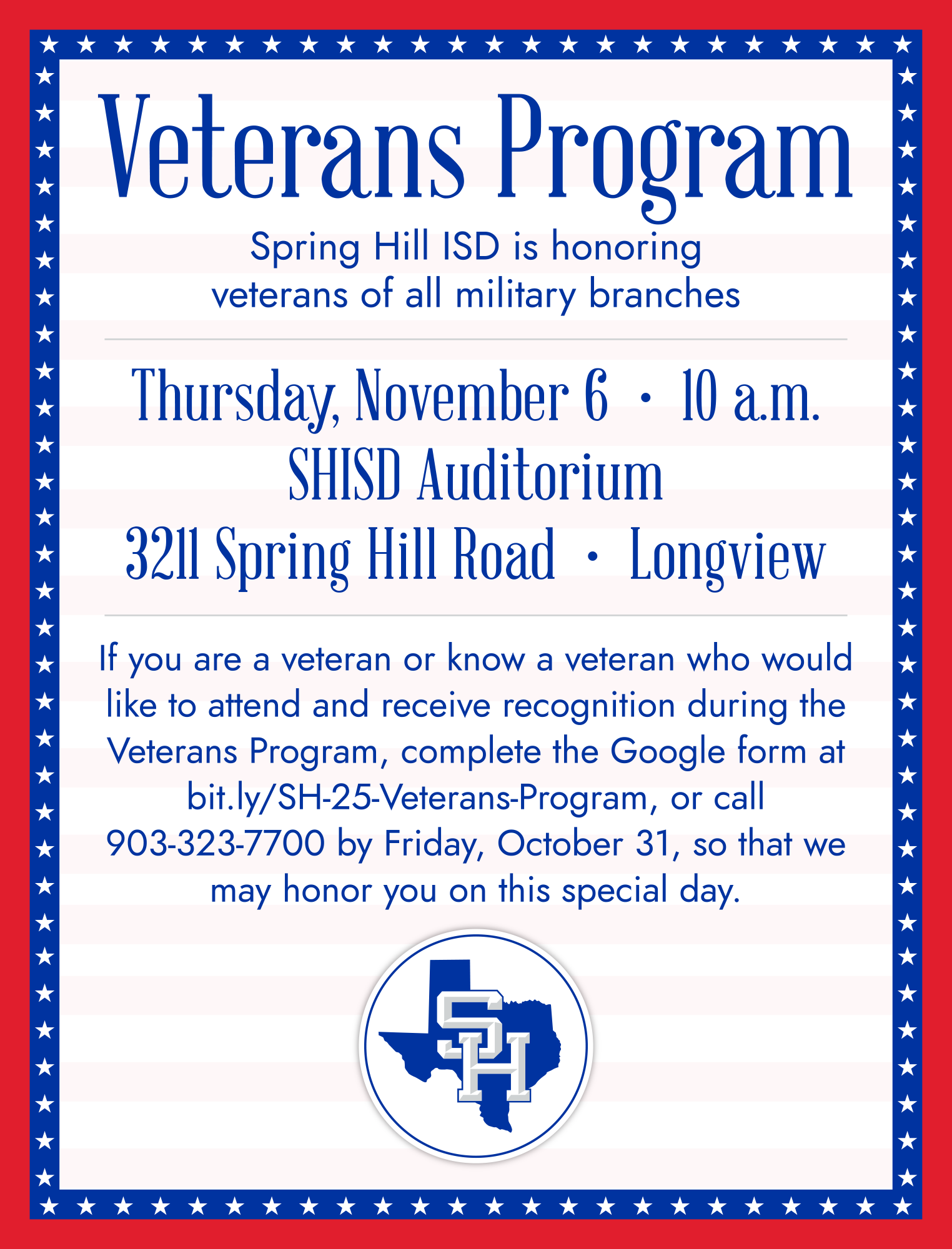 If you are a veteran or know a veteran who would like to attend and receive recognition during the Veterans Program, complete the Google form at bit.ly/SH-25-Veterans-Program, or call 903-323-7700 by Friday, October 31, so that we may honor you on this special day!